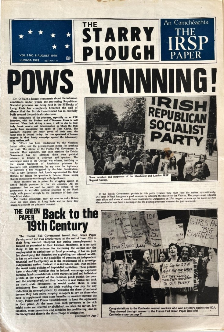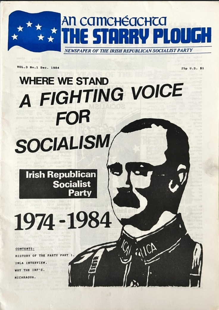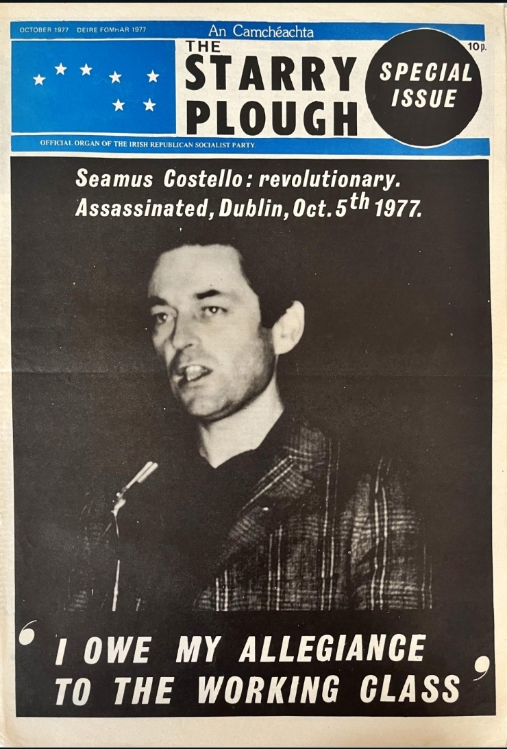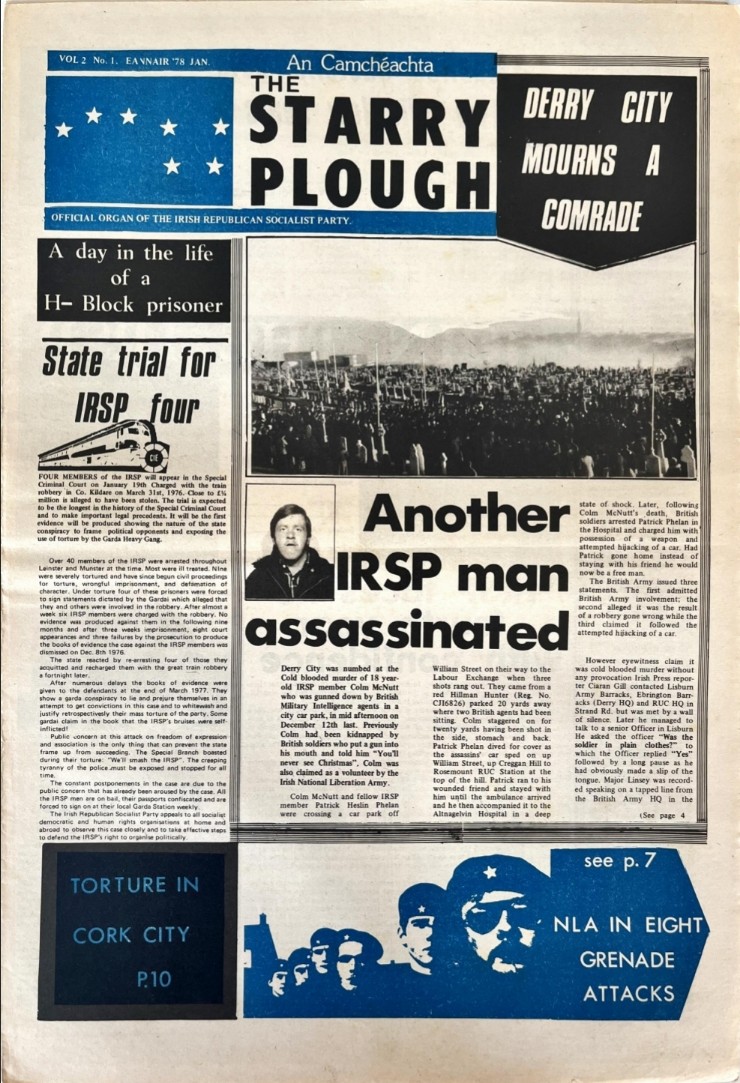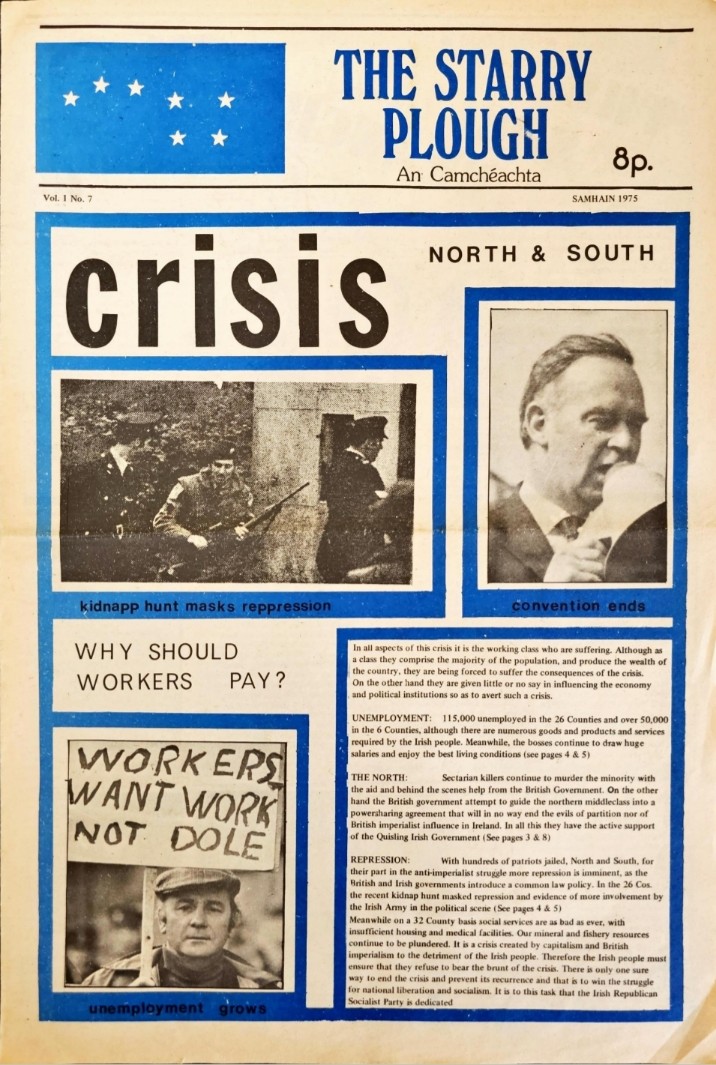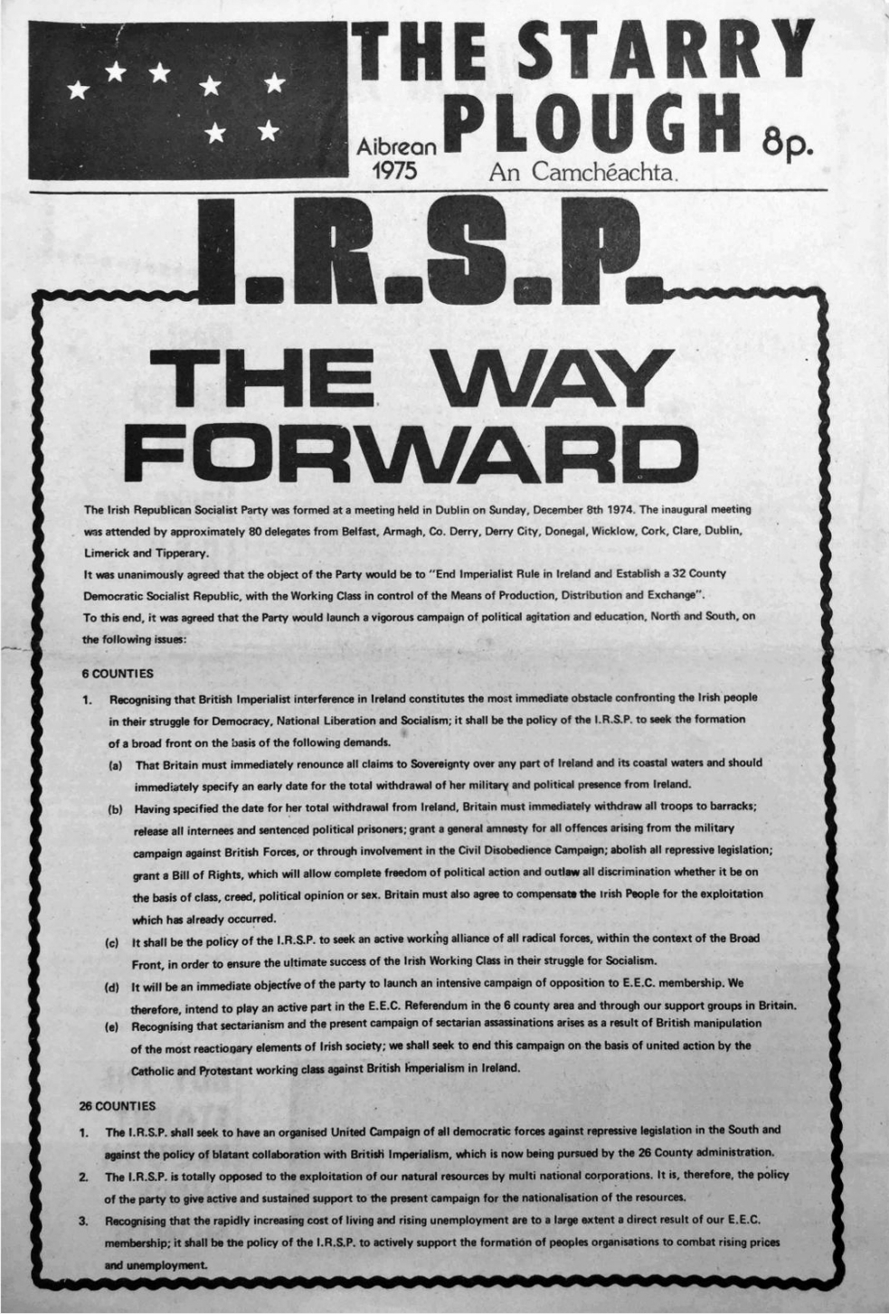 The first edition of the new (IRSP) The Starry Plough was published in April 1975 under the editorship of Mick Ahern. It included details of the first IRSP public meeting (Dublin, 12 February), an editorial on the IRSP, an interview with Seamus Costello, Easter Rising commemoration notices and a statement from the National Executive of the IRSP.