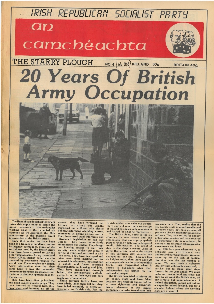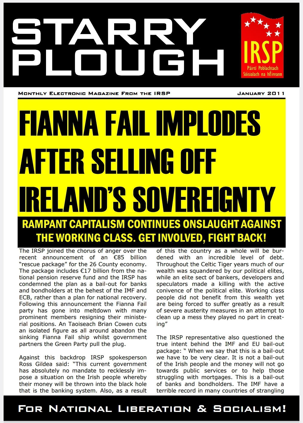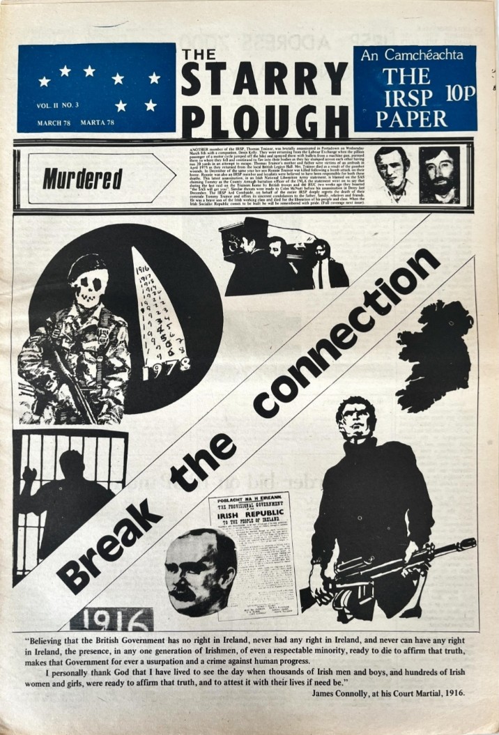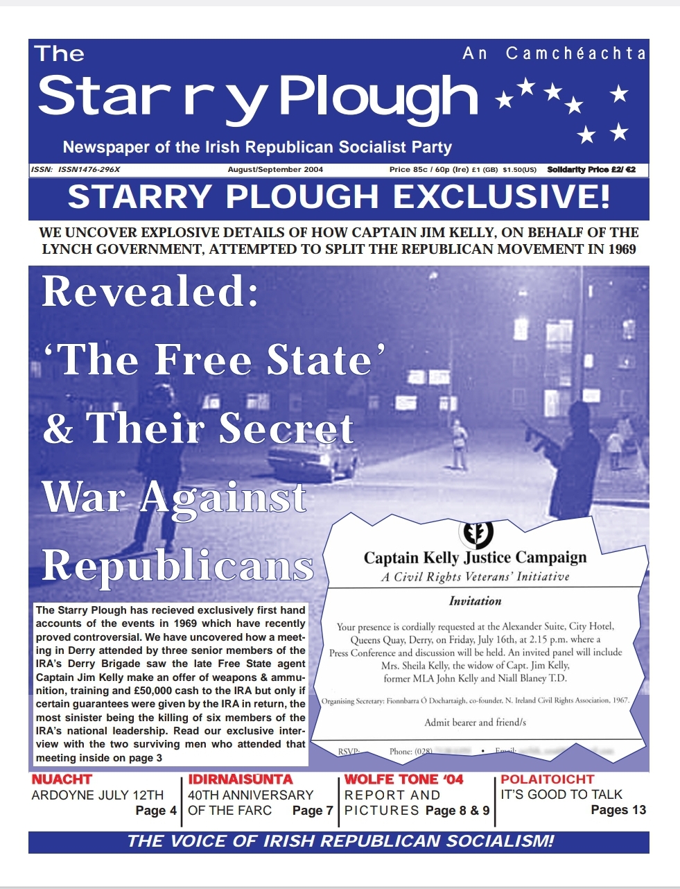 The first edition of the new (IRSP) The Starry Plough was published in April 1975 under the editorship of Mick Ahern. It included details of the first IRSP public meeting (Dublin, 12 February), an editorial on the IRSP, an interview with Seamus Costello, Easter Rising commemoration notices and a statement from the National Executive of the IRSP.