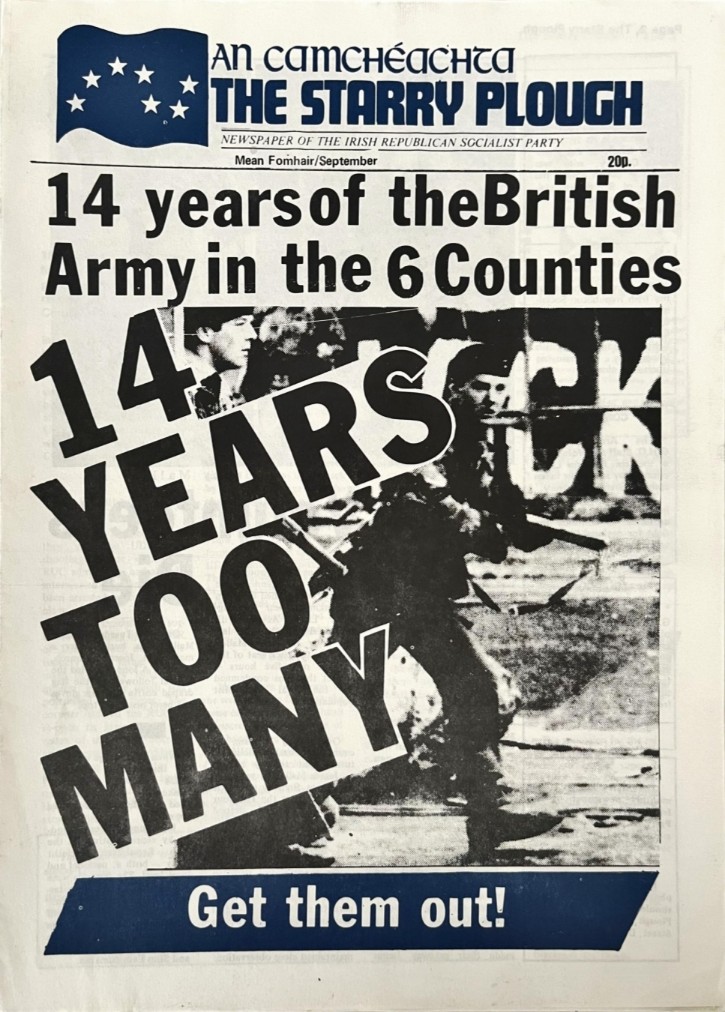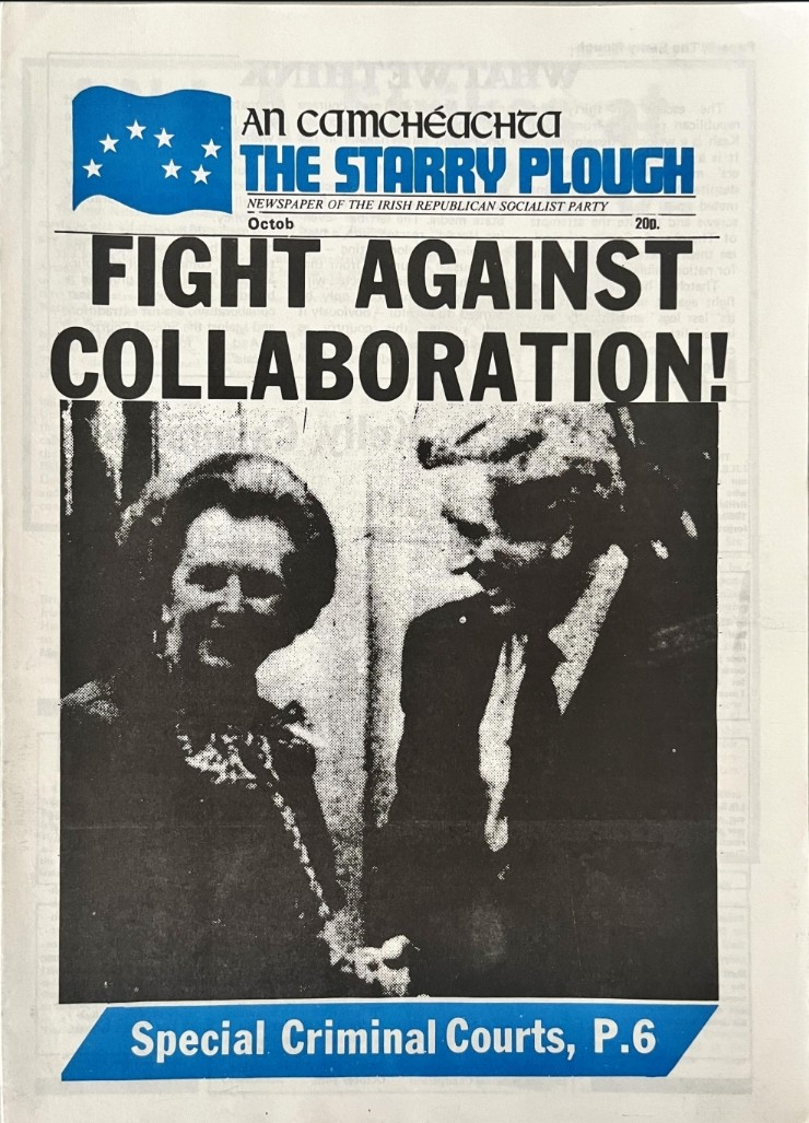 The name of the paper is taken from the flag of the same name. The decision to use the name the Starry Plough was inspired by a newspaper produced by Official Sinn Féin in Derry City in the early 1970s. Produced by the local branch of Official Sinn Féin in Derry, it was edited by Jackie Ward (who went on to edit The United Irishman)and Joe Sweeney (who sided with the IRSP following the split with the Officials). The suggestion for the IRSP newspaper was made by Derry members to the IRSP Ard Comhairle in early 1975. The Irish translation An Camchéachta was provided by Mairin Bean Ui Chionnaith, an Irish-language scholar and republican.