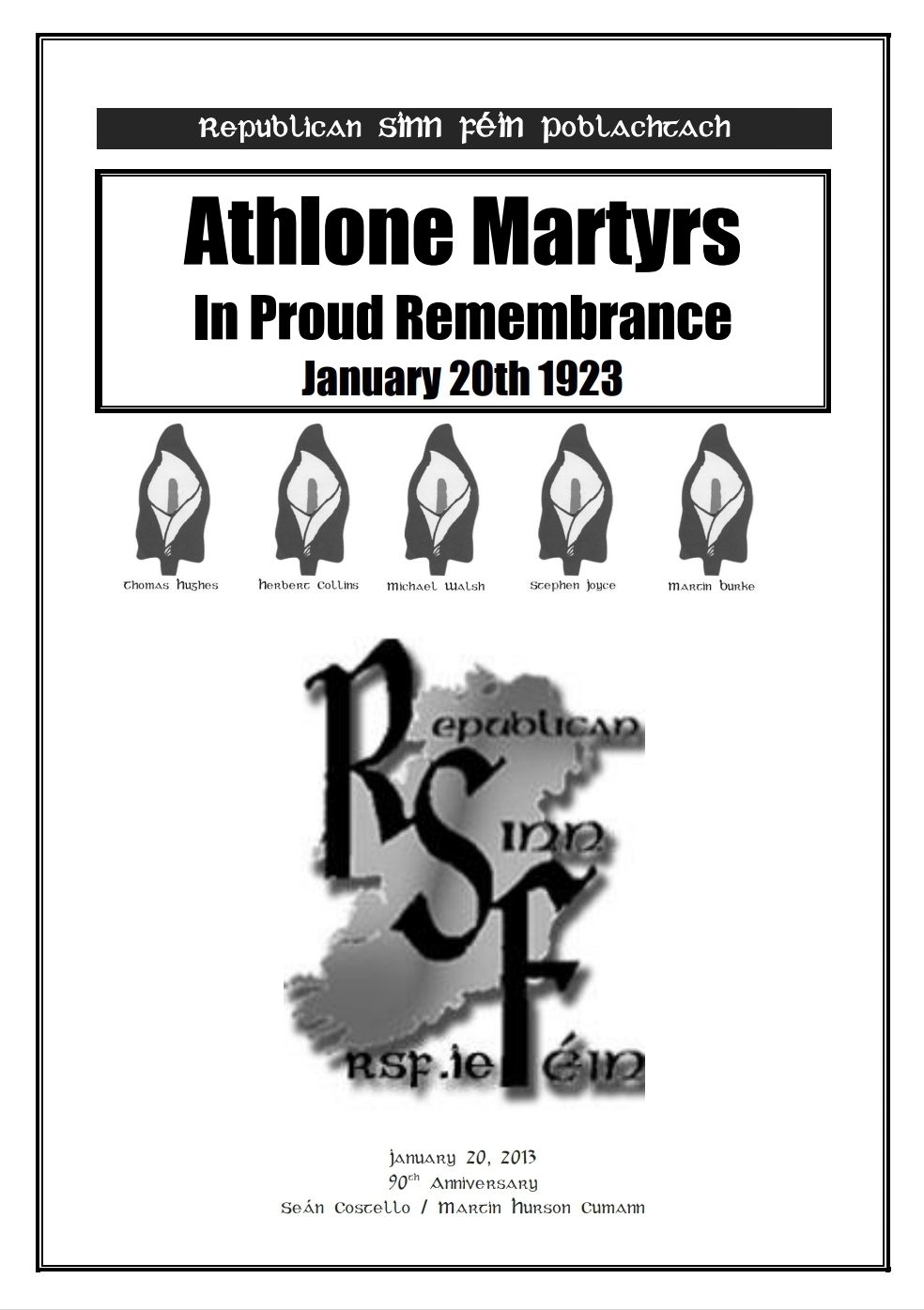 ![]() The Athlone Martyrs | A booklet produced in 2013 by Republican Sinn Féin on the 90th Anniversary of the execution of Thomas Hughes, Michael Walsh, Hubert Collins, Stephen Joyce and Martin Burke in Athlone Military Barracks on January 20th 1923. |