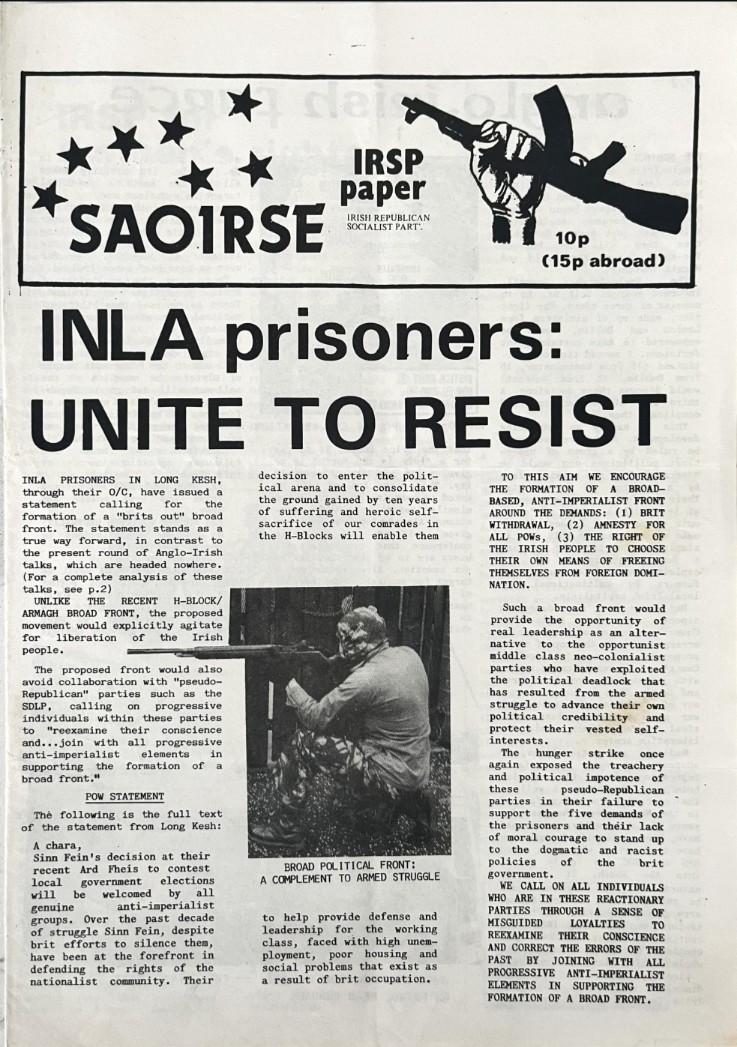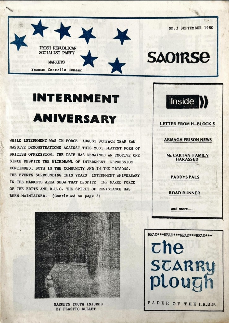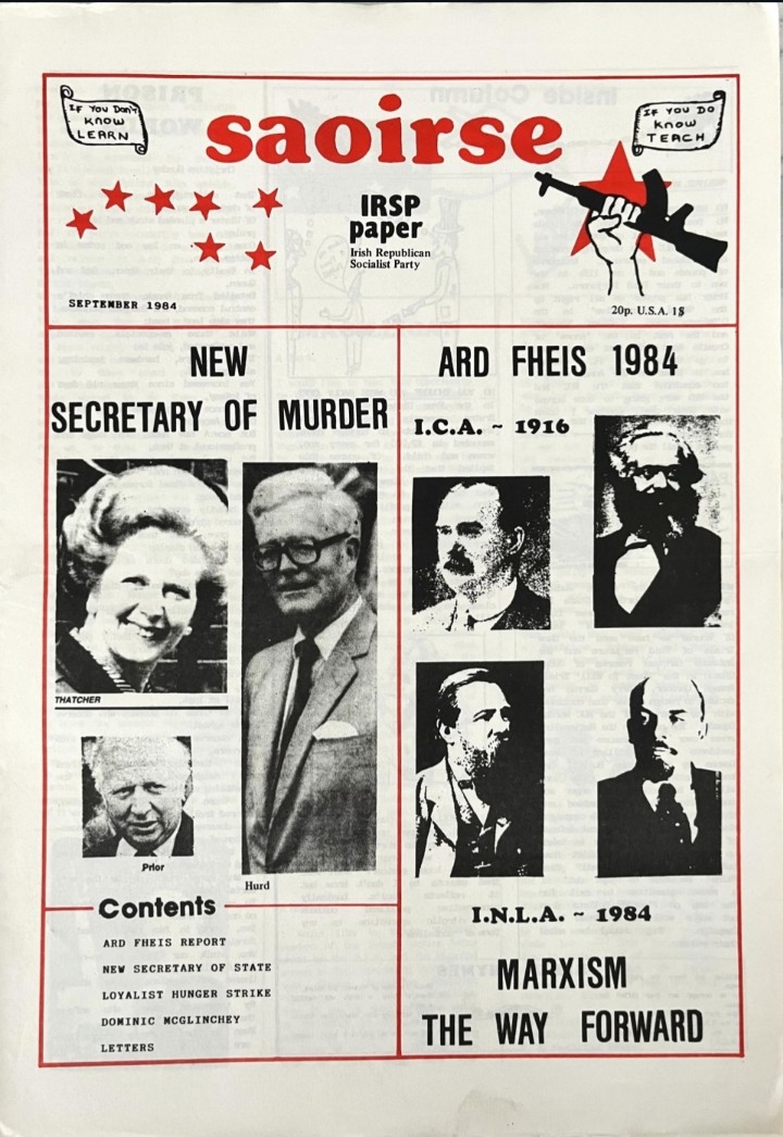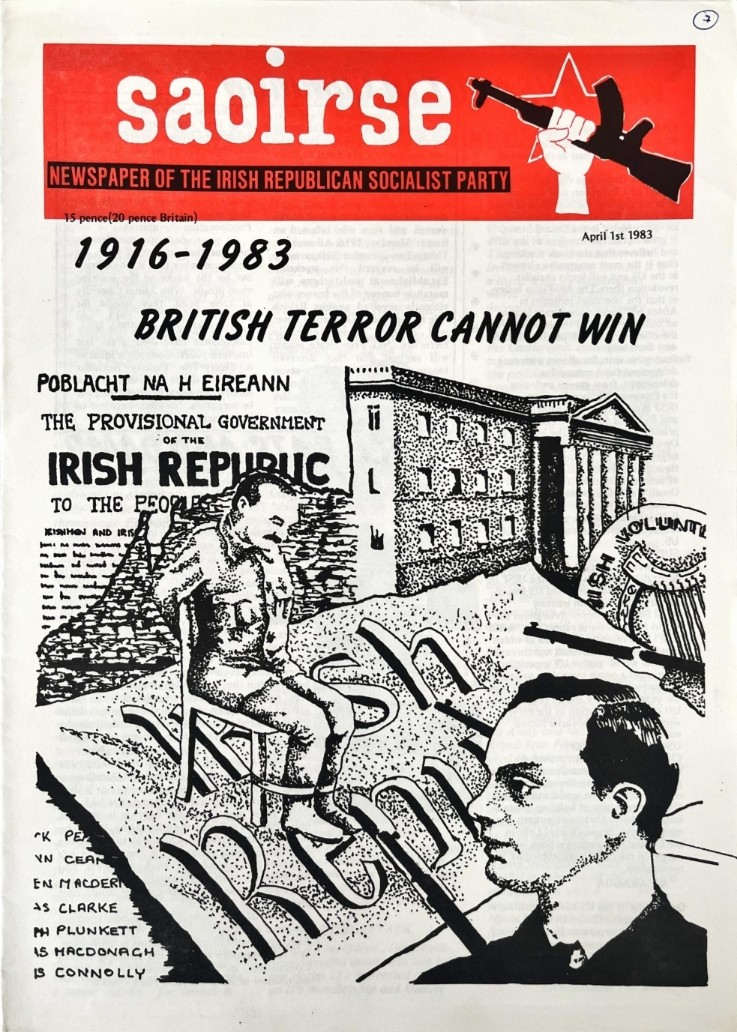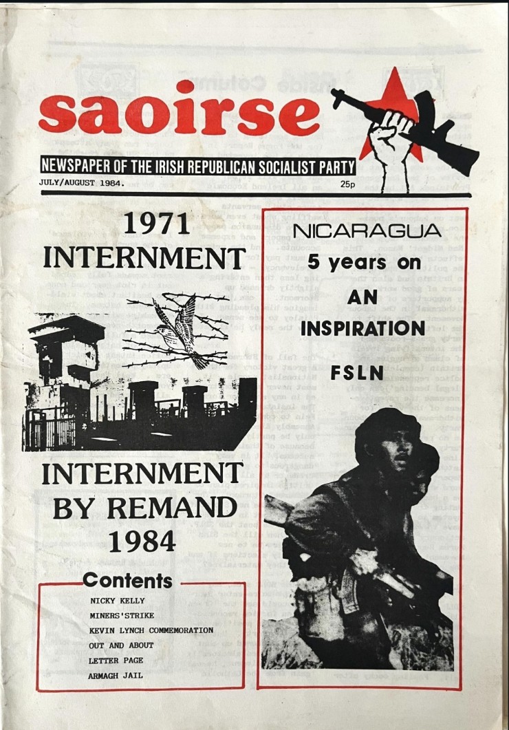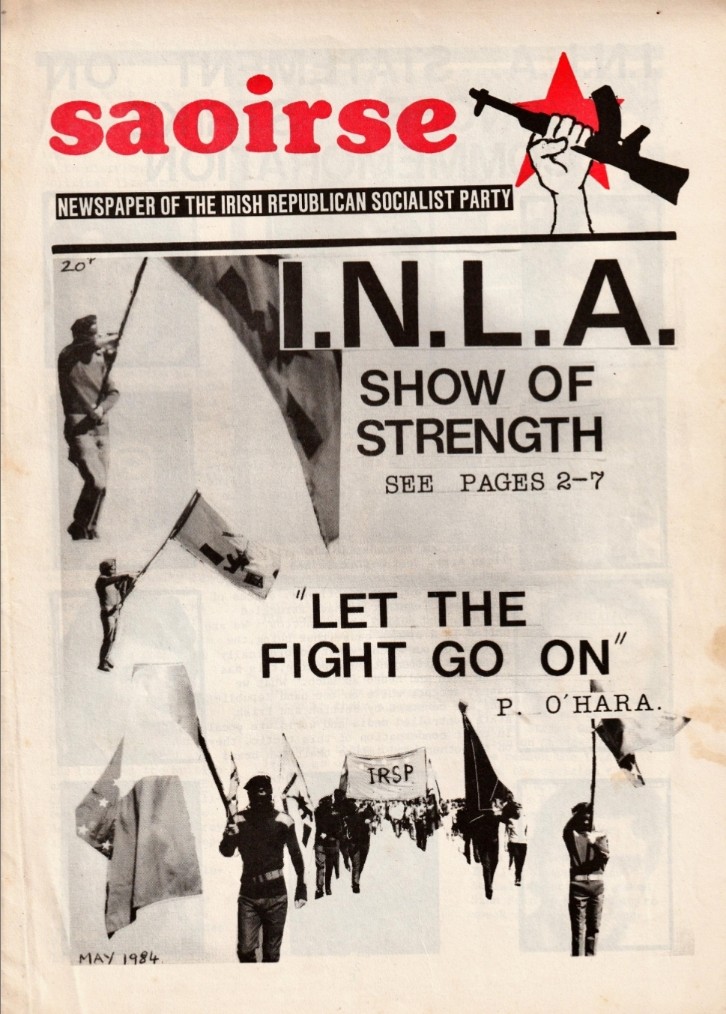 ‘Saoirse’ was a newspaper of the Irish Republican Socialist Party in Belfast which was first published in 1980 until circa 1985. It was produced sporadically with issues appearing bi-weekly, monthly and bi-monthly at times.