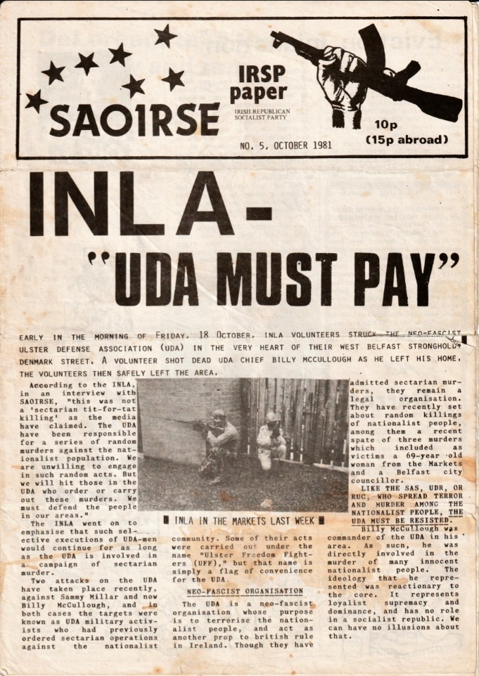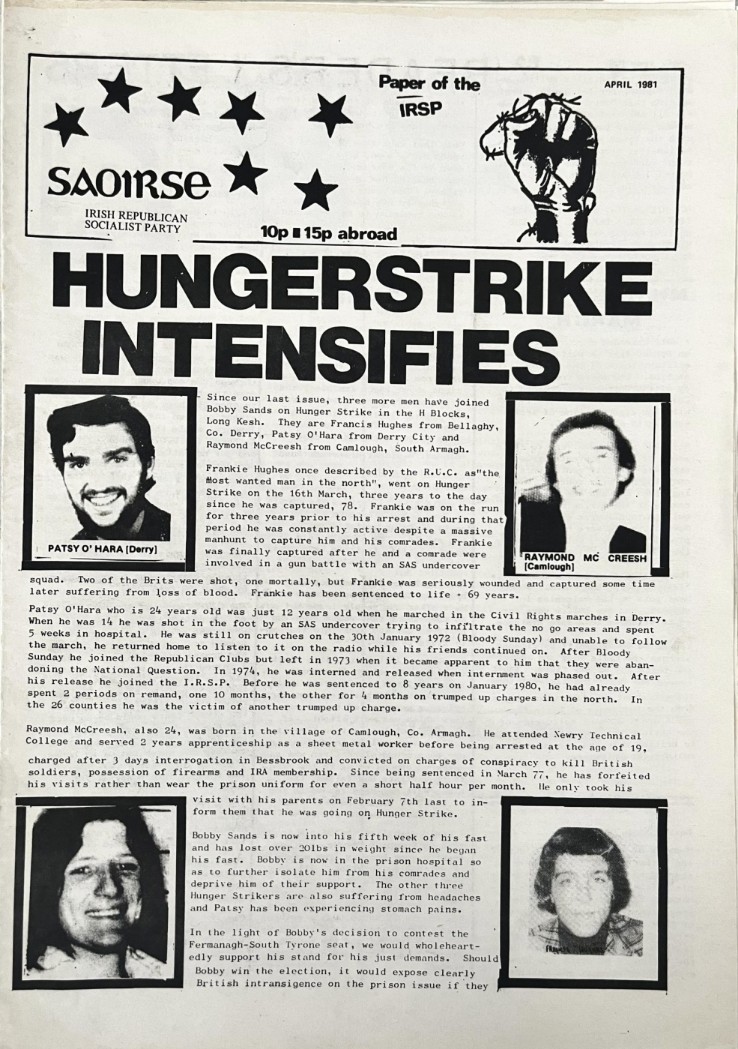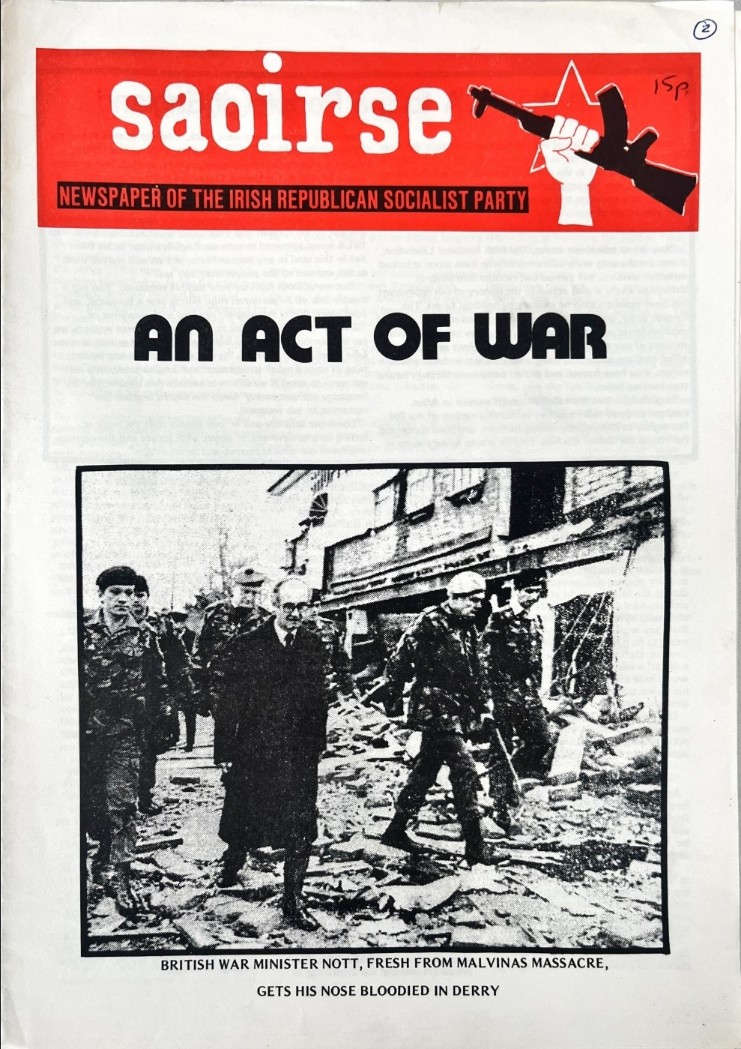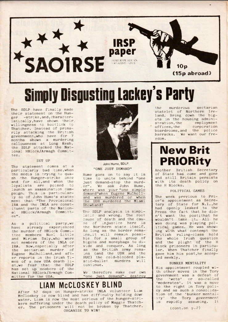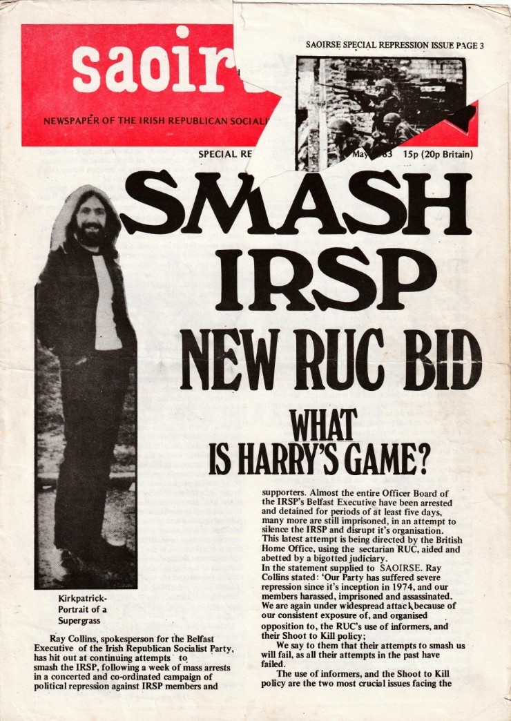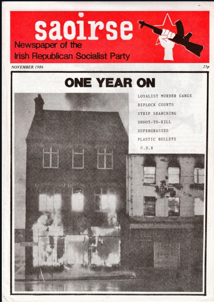 ‘Saoirse’ was a newspaper of the Irish Republican Socialist Party in Belfast which was first published in 1980 until circa 1985. It was produced sporadically with issues appearing bi-weekly, monthly and bi-monthly at times.