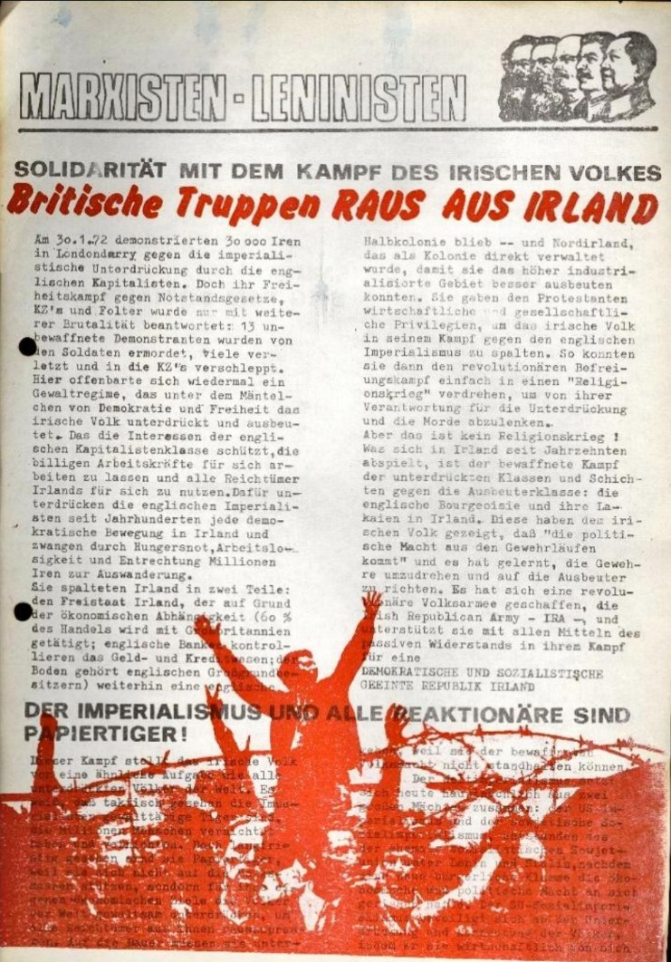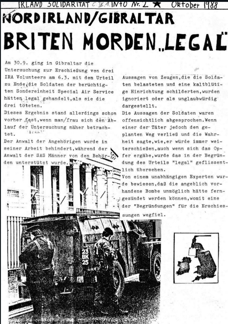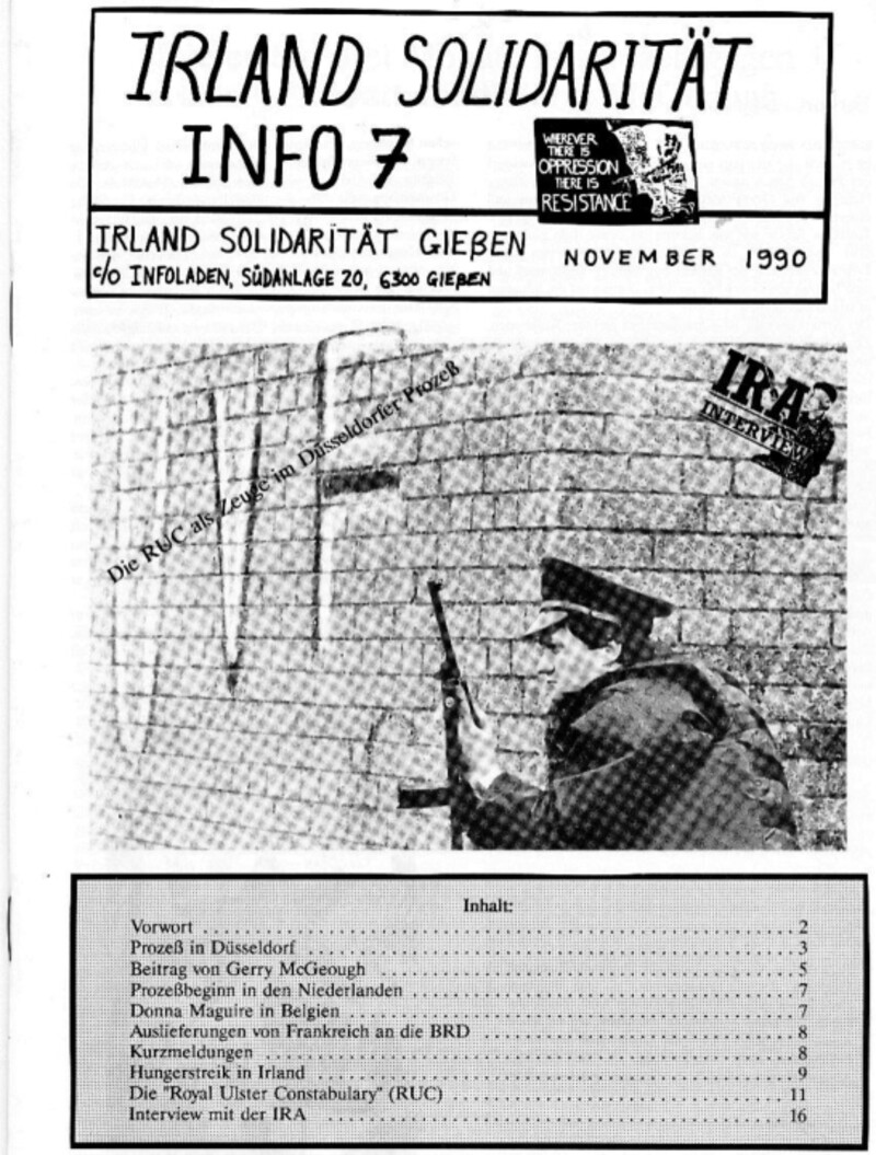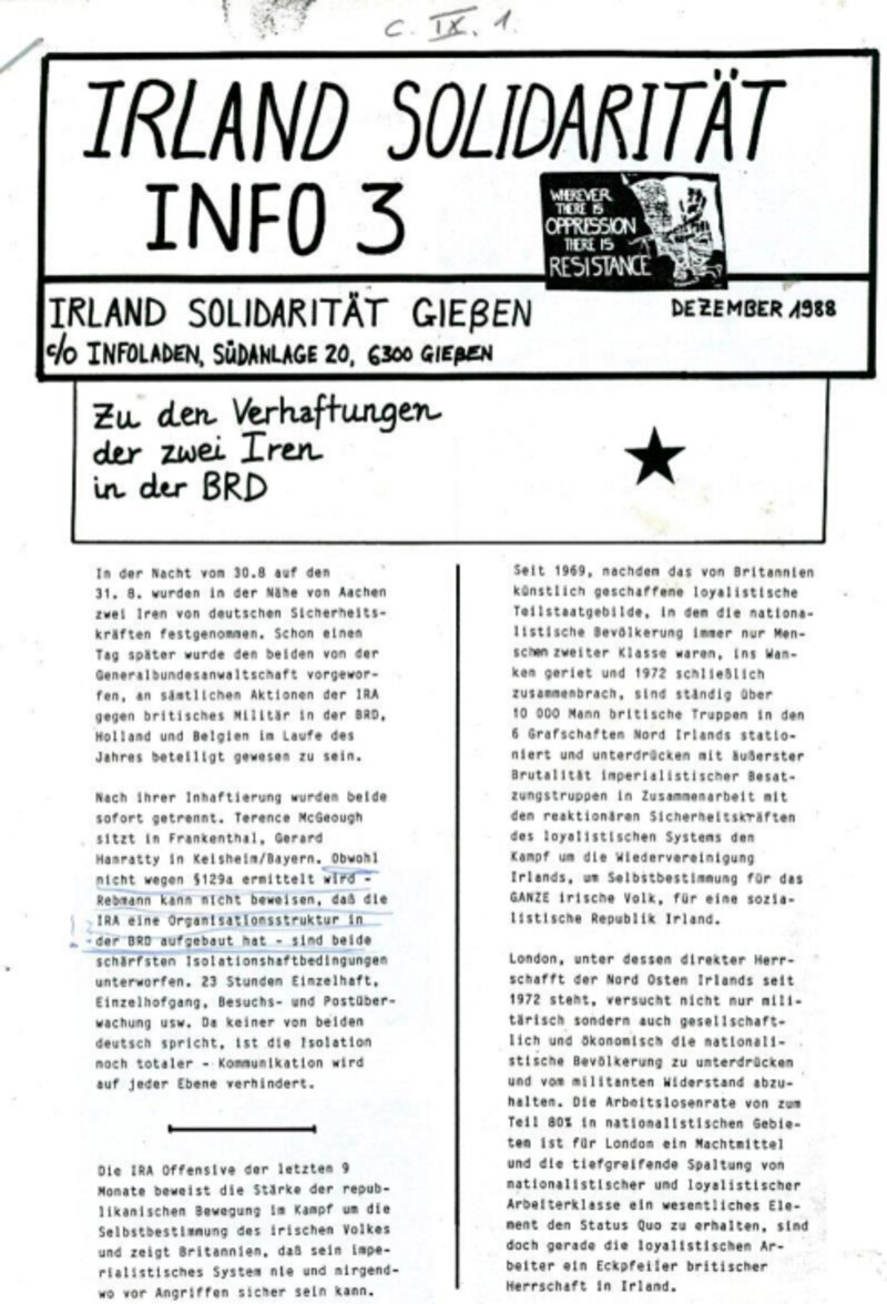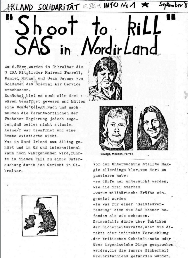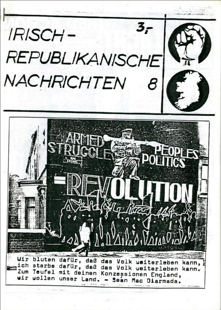 In West Germany during the 1970s and 1980s, a network of Irish republican support groups emerged, often linked to broader left-wing and anti-imperialist movements. These groups held public meetings, distributed literature, and organized protests outside British diplomatic offices, highlighting the parallels between the Irish struggle and other liberation movements worldwide. German solidarity groups frequently collaborated with Irish political prisoners’ campaigns and raised funds for republican causes.